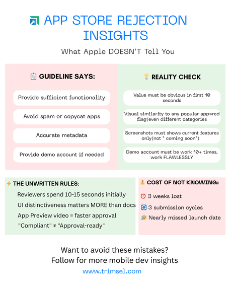REJECTION REASONS & REAL FIXES: → "Insufficient functionality" = Show value in first 10 seconds → "Spam/copycat" = UI must be visually distinct from popular apps → "Misleading metadata" = Screenshots must show CURRENT features only