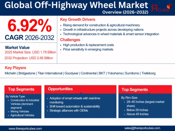 The Report Cube which is one of the leading market research company in UAE expects the Off-Highway Wheel Market to grow at a CAGR of around 6.92% through 2032, as highlighted in their latest research report. The study provides an in-depth analysis of the emerging trends shaping the Off-Highway Wheel Market and offers detailed forecasts for its potential growth during 2026–2032. The report also presents a comprehensive assessment of the competitive landscape, including profiles of leading players, their performance metrics, and recent strategic developments. Additionally, it explores the key market drivers, challenges, opportunities, and provides insights into historical and future revenue trends at the global, regional, and country levels.